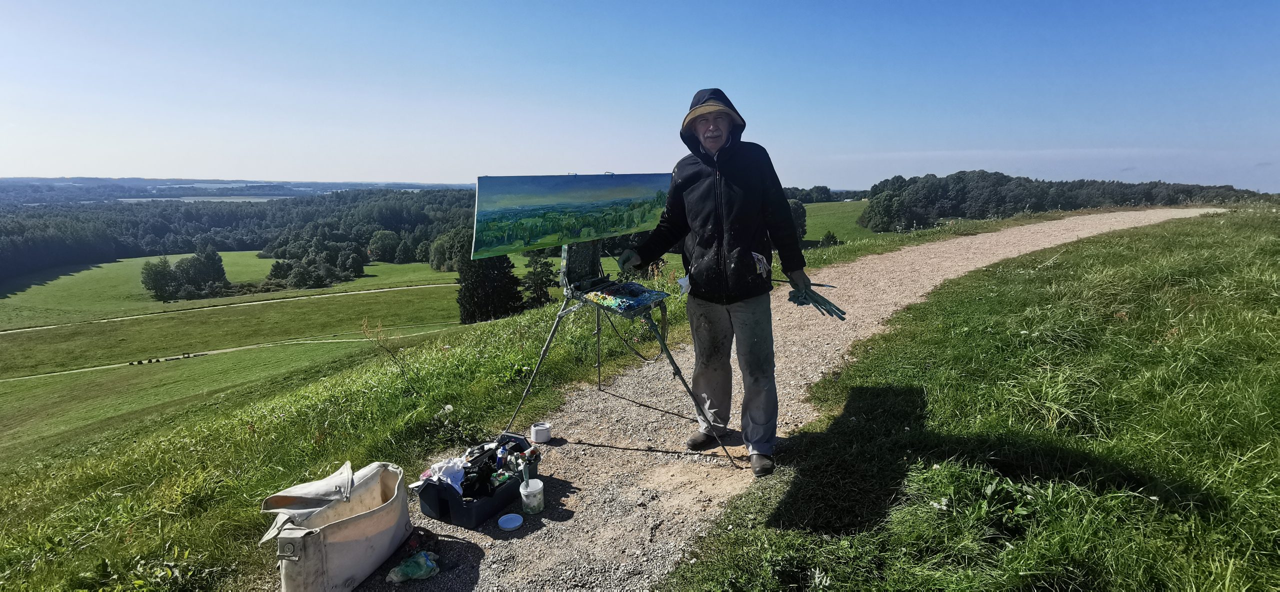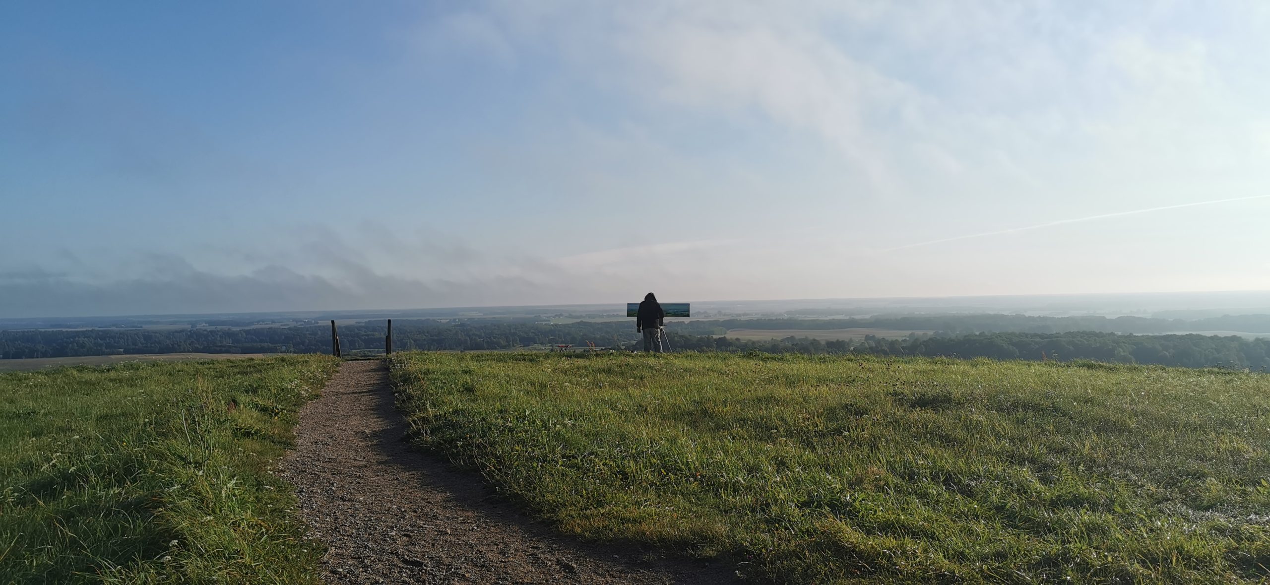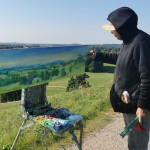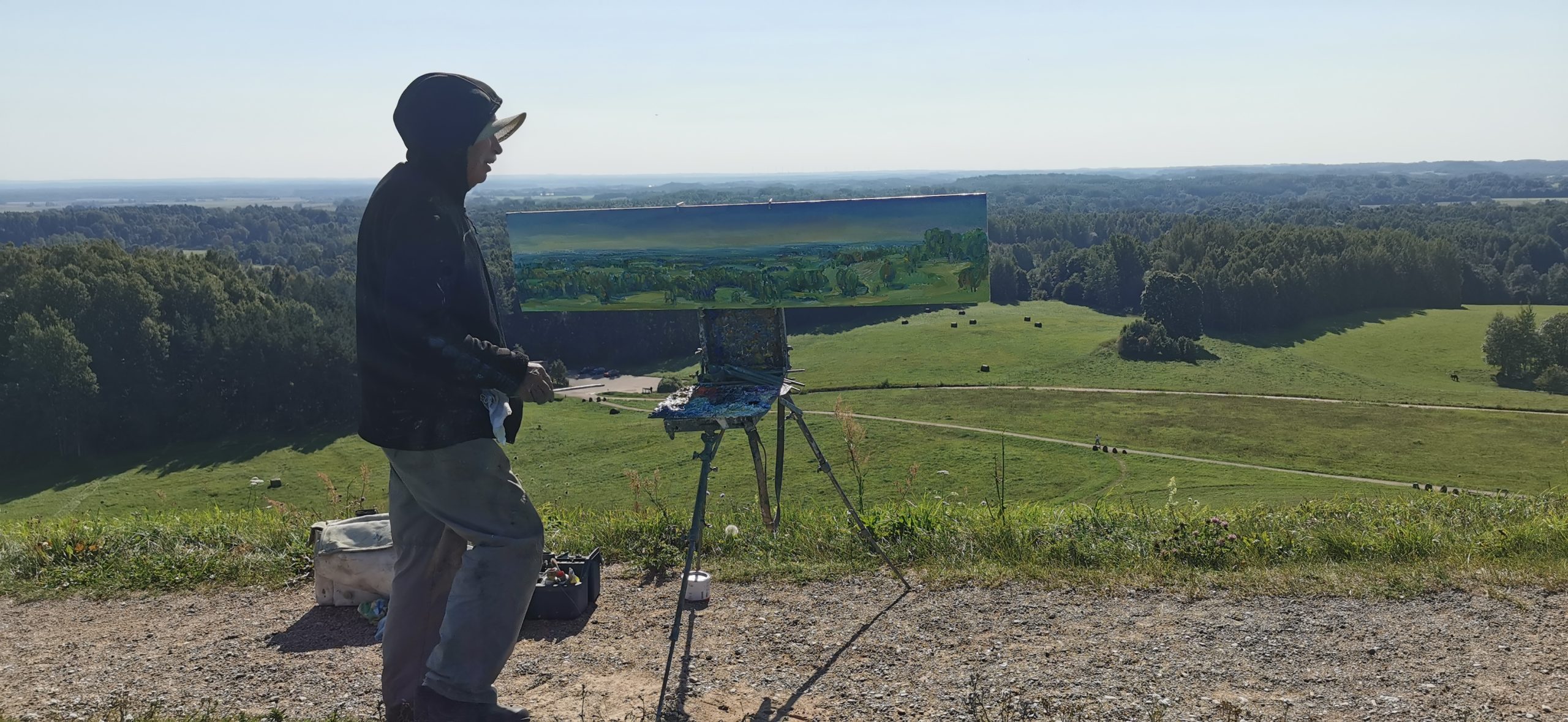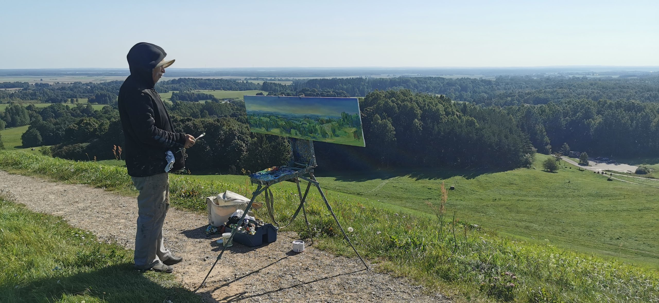 Tapybos pleneras Žemaitijoje ant Šatrijos kalno 2025 09 1-2 Saulei nuostabiai auštant virš Žemaitijos visa žemė apšviečiama sidabriniais Saulės spinduliais. Pabunda gamta ir pasaulis. Tuo metu tapiau Sidabrinės Saukės patėkimo kerintį vaizdą kada žemė atsiskiria nuo dangaus. Nuo kalno viršaus atsiveria nuostabus Žemaičių žemės grožis. Tapiau auštančios dienos ankstyvą rytą ant Šatrijos kalno šaltą ir vėjuotą sidabrinės Saulės užtekėjimą. Nutapiau didelė dviejų dalių gamtovaizdžio panoramą.