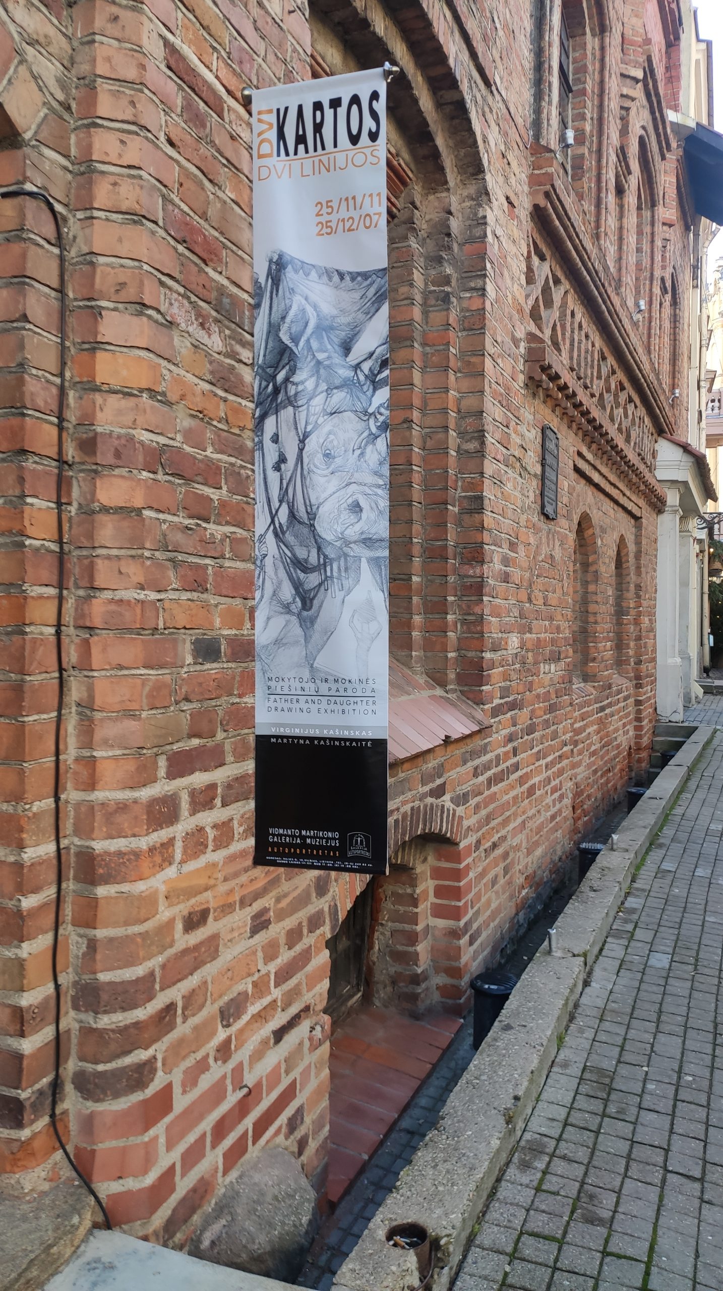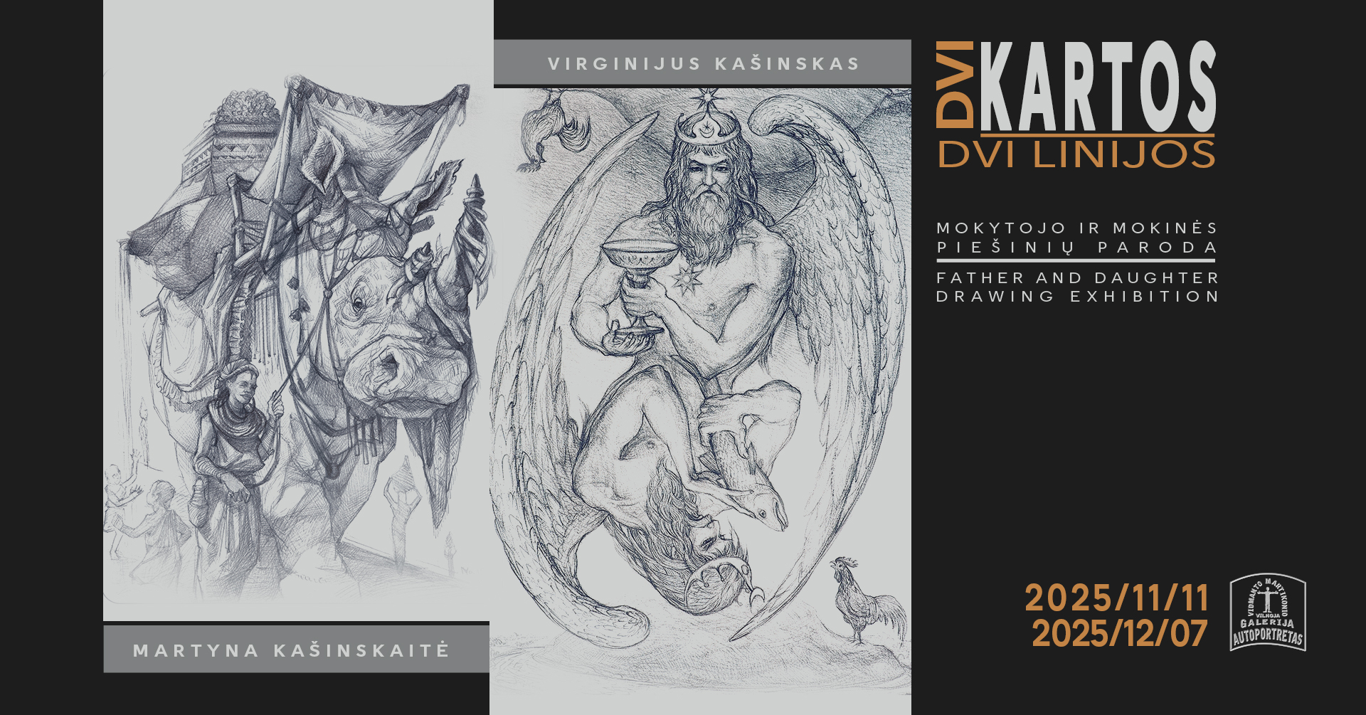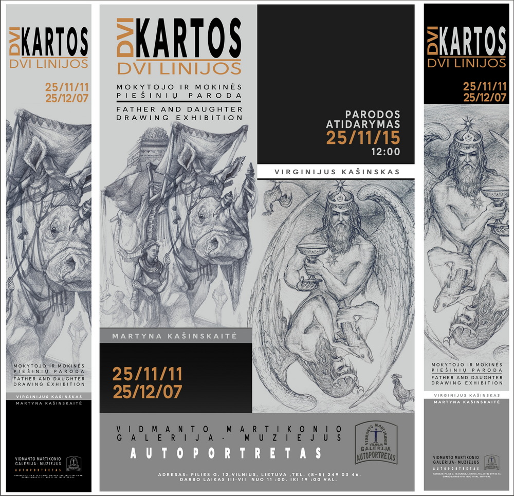 Parodoje „Dvi kartos – dvi linijos“ pristatomi tėvo ir dukros, mokytojo ir mokinės – Virginijaus Kašinsko ir Martynos Kašinskaitės – piešiniai. Tai dviejų kartų kūrėjų dialogas, kuriame susitinka patirtys, pasaulėjauta ir skirtingos meninės kalbos formos. Ekspozicijoje rodoma tiek ankstyvoji, tiek vėlyvoji abiejų autorių kūryba, atskleidžianti, kaip per laiką brendo jų vaizduotės pasauliai ir linijos mąstysena. Parodoje persipina dvi meninės trajektorijos – dviejų kūrėjų pasauliai, kurie, nors ir saviti, kalba ta pačia kalba – piešinio. Virginijaus Kašinsko kūryboje piešinys yra ne tik meninė išraiška, bet ir pagrindinis mąstymo bei pasaulio suvokimo įrankis. Linija jam tampa gyvu būties liudijimu, jungiančiu žmogų, gamtą ir mitą. Jo darbuose figūra, mitas ir simbolis susilieja į vieną visumą, atveriančią archetipinius žmogaus egzistencijos sluoksnius. Parodoje pristatomi darbai „Vandenis ir undinė“, „Medinčius“, „Vėjopatis“, „Vaisingumo akmenys“ išryškina šį santykį tarp regimo ir neregimo pasaulio, tarp dabarties ir archajinės atminties. Martynos Kašinskaitės kūryboje linija įgauna šiuolaikinę skaitmeninio piešinio formą, tačiau išsaugo klasikinės grafikos jautrumą ir preciziką. Menininkė tyrinėja žmogaus ir gyvūno santykį, jų bendrabūvį ir dvasinę sąsają. Jos darbuose gyvūnas tampa žmogaus kompanionu, lydinčiu per vidinius pasaulius ir mitinius peizažus. Tėvo ir dukros kūryboje atpažįstamas ryšys – ne tik kraujo, bet ir idėjų, pasaulio matymo bei meninės mąstysenos. Virginijus Kašinskas daugelį metų buvo savo dukros mokytojas – tiek piešimo subtilybių, tiek mąstymo per liniją prasme. Martyna šį palikimą tęsia savaip – jungdama tradiciją su šiuolaikinėmis technologijomis, perteikdama piešinio galią naujais būdais. Ši paroda – tai dviejų kūrėjų pokalbis apie liniją kaip atmintį, kvėpavimą ir tiltą tarp kartų. „Dvi kartos – dvi linijos“ kviečia žiūrovą patirti, kaip piešinys tampa kalba, kuria galima kalbėti be žodžių – apie žmogų, mitą ir pasaulį, kuriame abu autoriai randa savitą tiesą ir darną.