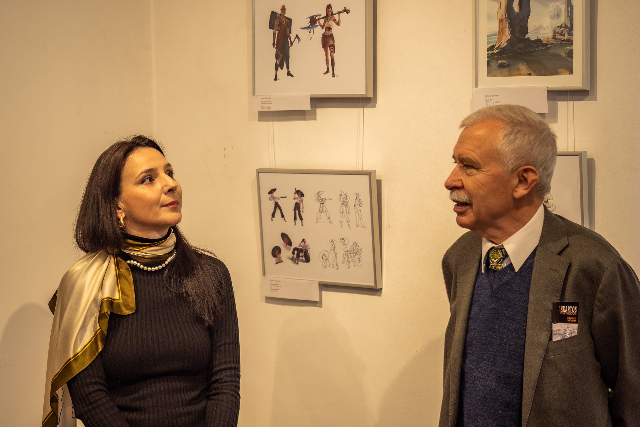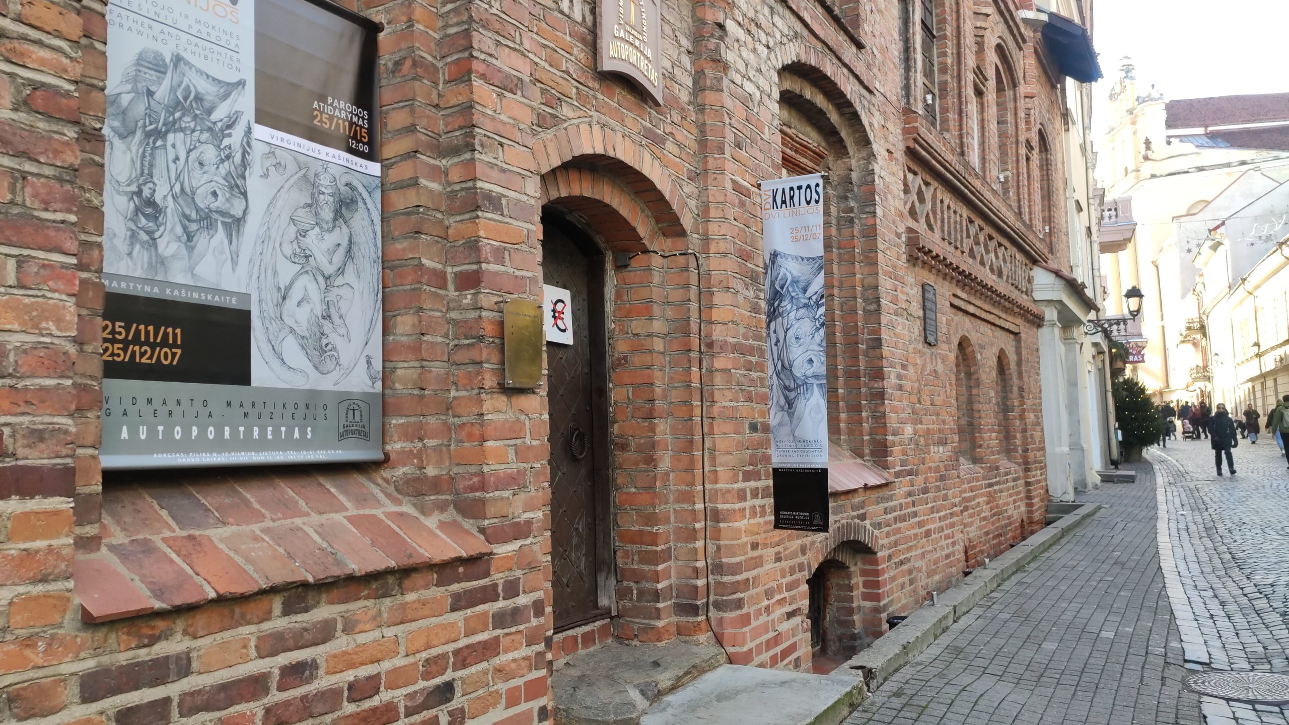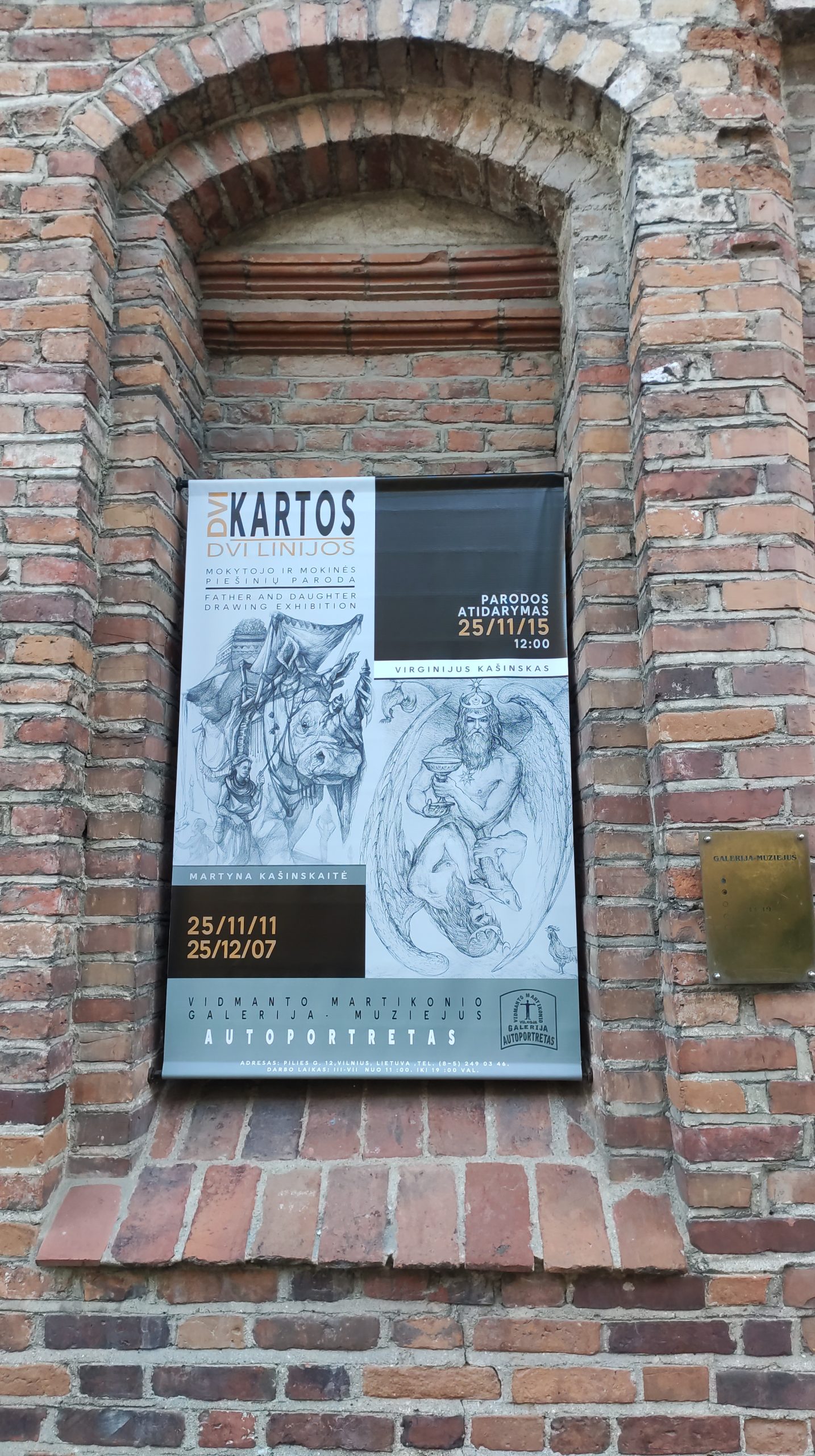 Parodoje „Dvi kartos – dvi linijos“ pristatomi tėvo ir dukros, mokytojo ir mokinės – Virginijaus Kašinsko ir Martynos Kašinskaitės – piešiniai. Tai dviejų kartų kūrėjų dialogas, kuriame susitinka patirtys, pasaulėjauta ir skirtingos meninės kalbos formos. Ekspozicijoje rodoma tiek ankstyvoji, tiek vėlyvoji abiejų autorių kūryba, atskleidžianti, kaip per laiką brendo jų vaizduotės pasauliai ir linijos mąstysena. Parodoje persipina dvi meninės trajektorijos – dviejų kūrėjų pasauliai, kurie, nors ir saviti, kalba ta pačia kalba – piešinio. Virginijaus Kašinsko kūryboje piešinys yra ne tik meninė išraiška, bet ir pagrindinis mąstymo bei pasaulio suvokimo įrankis. Linija jam tampa gyvu būties liudijimu, jungiančiu žmogų, gamtą ir mitą. Jo darbuose figūra, mitas ir simbolis susilieja į vieną visumą, atveriančią archetipinius žmogaus egzistencijos sluoksnius. Parodoje pristatomi darbai „Vandenis ir undinė“, „Medinčius“, „Vėjopatis“, „Vaisingumo akmenys“ išryškina šį santykį tarp regimo ir neregimo pasaulio, tarp dabarties ir archajinės atminties. Martynos Kašinskaitės kūryboje linija įgauna šiuolaikinę skaitmeninio piešinio formą, tačiau išsaugo klasikinės grafikos jautrumą ir preciziką. Menininkė tyrinėja žmogaus ir gyvūno santykį, jų bendrabūvį ir dvasinę sąsają. Jos darbuose gyvūnas tampa žmogaus kompanionu, lydinčiu per vidinius pasaulius ir mitinius peizažus. Tėvo ir dukros kūryboje atpažįstamas ryšys – ne tik kraujo, bet ir idėjų, pasaulio matymo bei meninės mąstysenos. Virginijus Kašinskas daugelį metų buvo savo dukros mokytojas – tiek piešimo subtilybių, tiek mąstymo per liniją prasme. Martyna šį palikimą tęsia savaip – jungdama tradiciją su šiuolaikinėmis technologijomis, perteikdama piešinio galią naujais būdais. Ši paroda – tai dviejų kūrėjų pokalbis apie liniją kaip atmintį, kvėpavimą ir tiltą tarp kartų. „Dvi kartos – dvi linijos“ kviečia žiūrovą patirti, kaip piešinys tampa kalba, kuria galima kalbėti be žodžių – apie žmogų, mitą ir pasaulį, kuriame abu autoriai randa savitą tiesą ir darną.