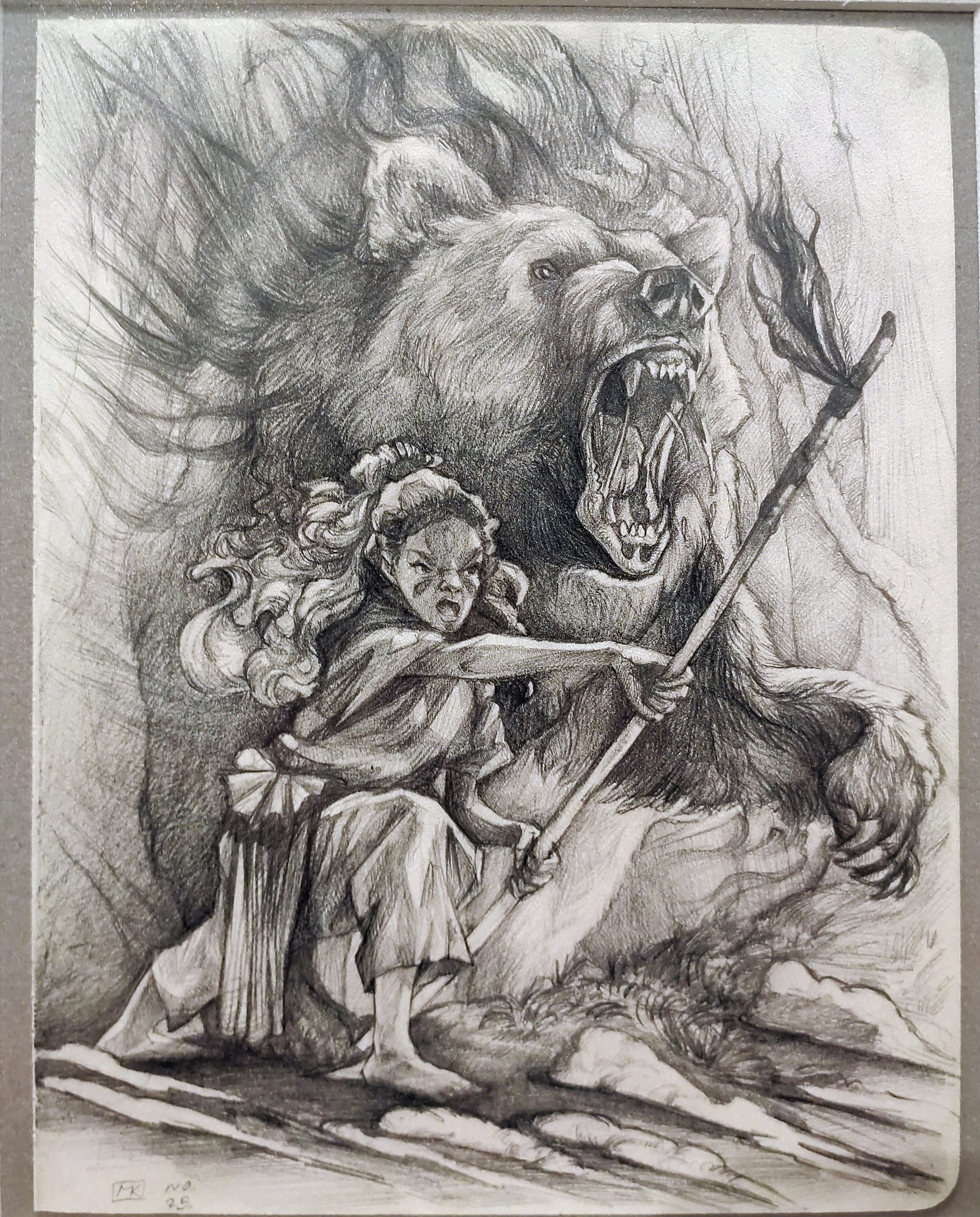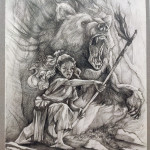 “Puslapiai is eskizų sąsiuvinio” Savo kūryboje daug dėmesio skiriu žmogaus ir gyvūno santykiui, jų tarpusavio ryšiui bei pasaulių susiliejimui. Man įdomi simbiozė tarp žmogaus ir gyvūno – ne kaip priešybių, o kaip vienas kitą papildančių būtybių, tarp kurių vyksta tylus, organiškas dialogas. Mano piešiniuose gyvūnai dažnai įgauna milžiniškas, mitines formas, o žmogus tampa mažesnis – tai būdas parodyti, kad be gamtos, be mitų ir senųjų būtybių žmogaus pasaulis būtų tuščias.
